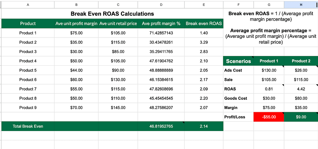 For businesses with large product collections, this ROAS calculator can handle big data sets. Simply add more rows and update the average formula.